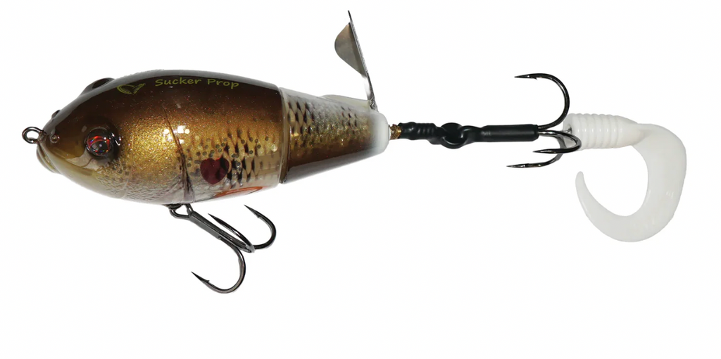 generating loud splashing sounds and vibrations to mimic struggling prey, drawing aggressive attention from lurking muskies. Crafted for durability and performance, the body boasts a lifelike Sucker profile with built in squeaker, making it irresistible. Whether you're casting through calm or choppy waters, the Savage Sucker Prop ensures long-distance casts and an irresistible surface disturbance, guaranteeing more bites and thrilling topwater action.